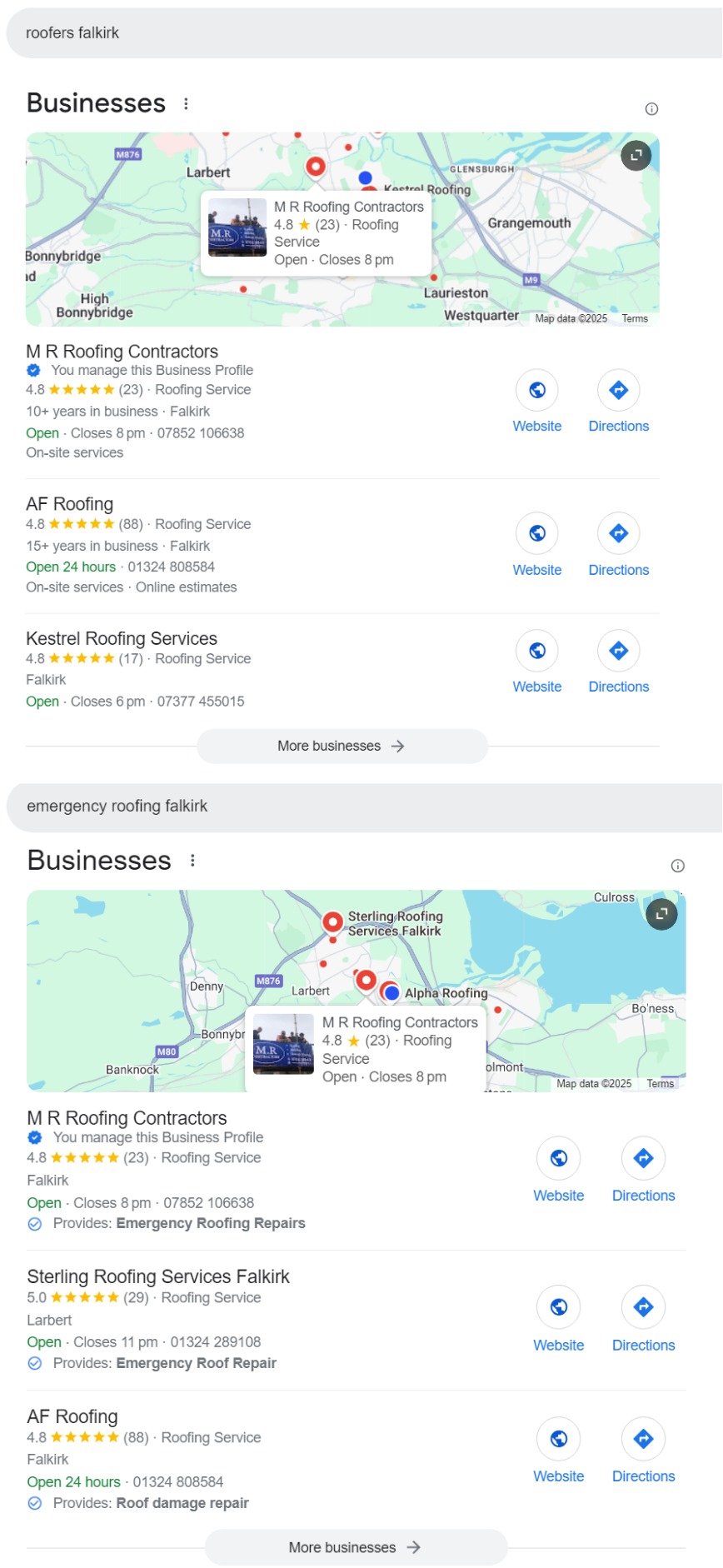 We took that stress away for them. Now all they have to do is focus on the roofing and we handle the rest. We’ve taken them from the deep pages of Google all the way to the front page for many relevant local keywords including “Falkirk Roofing Services”, “Emergency Roofing Falkirk” and many more.